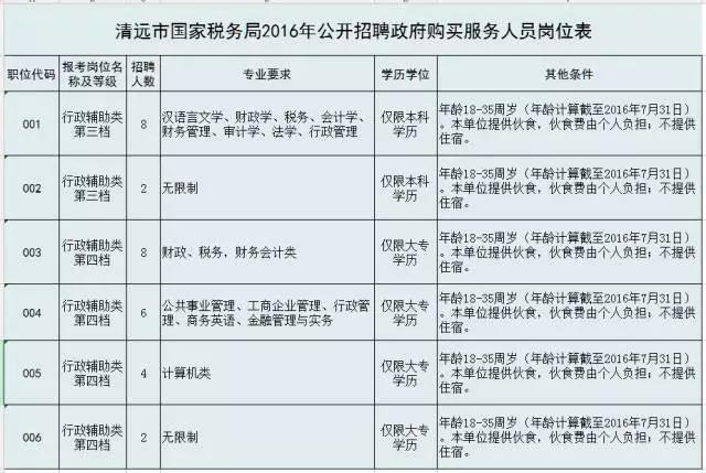 具體招聘職位和人數(shù)見《清遠市國家稅務(wù)局2016年公開招聘政府購買服務(wù)人員崗位表》(附件1)。